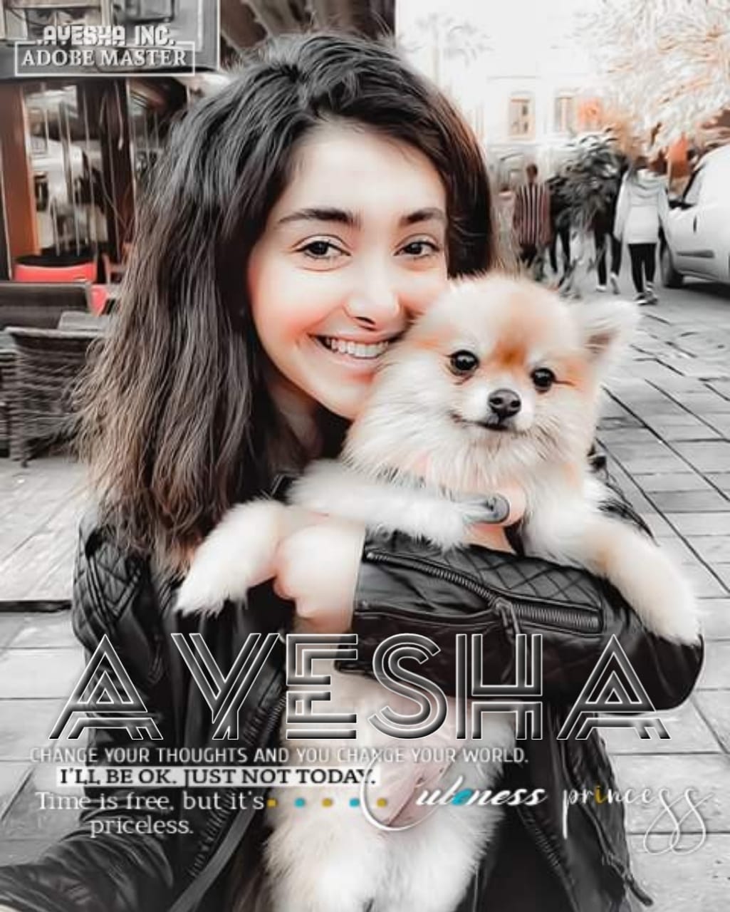 Stylish girl photo and Ayesha written on it with stylish font. Photo edit credit goes to respected editor. Pretty Pomeranian Puppy with girl. Ayesha name wallpaper with puppy, Explore the more photos of Ayesha with her name. Download as wallpaper because photo quality and dimension is high.