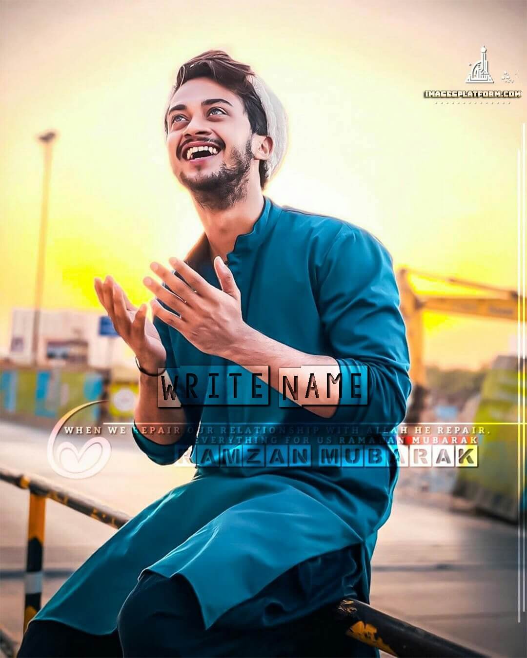 Boy praying wallpaper edit with name setting on. Get unlimited name boy Ramadan profile picture with the transparent font style.