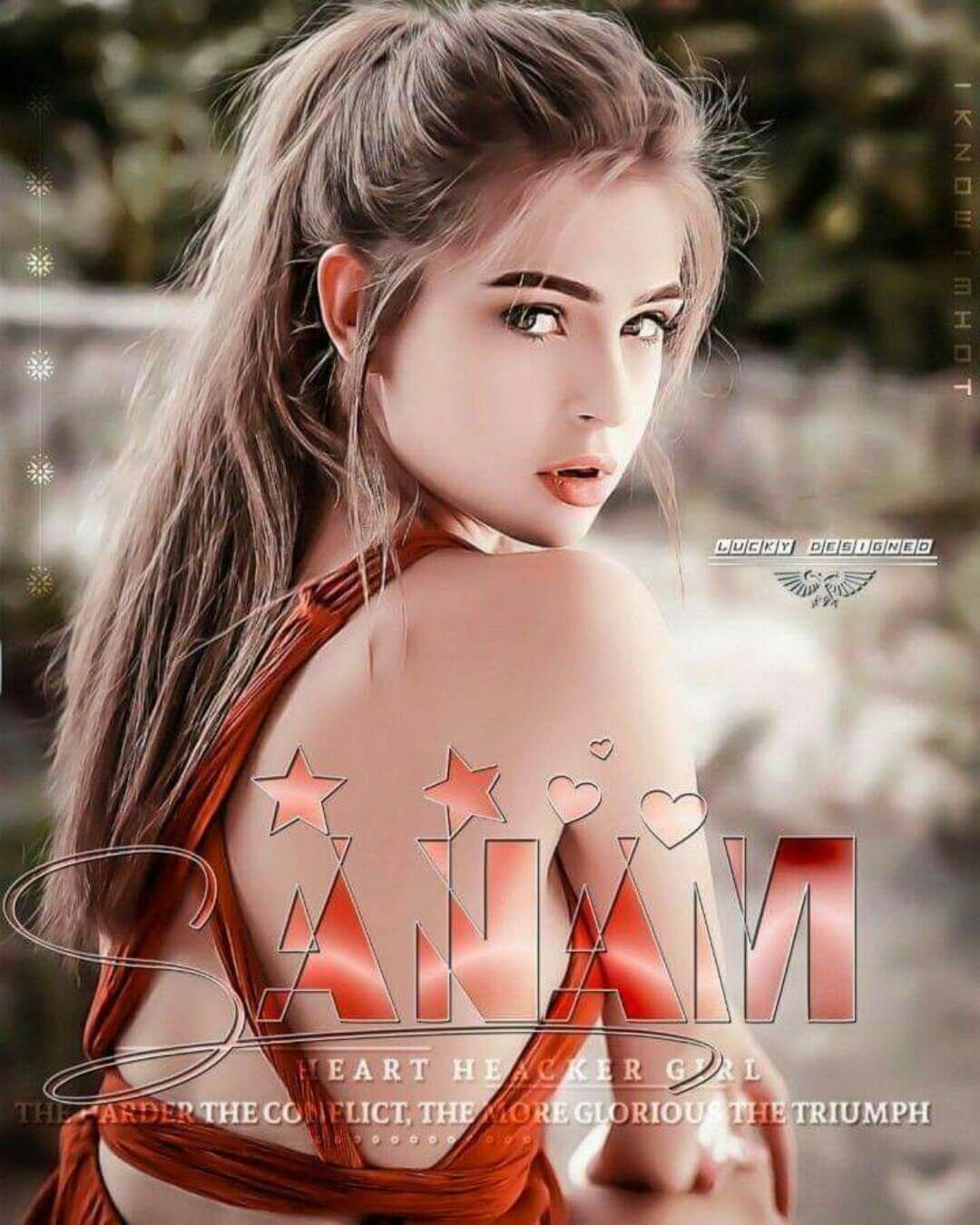 Beautiful girl Sanam name hd dp for girls. If you want to use hot girl photo as wallpaper with text sanam written then you can use our site images freely. Image may contain a girl in red dress with glass font text apply on her pic. Sanam lucky number is 9.